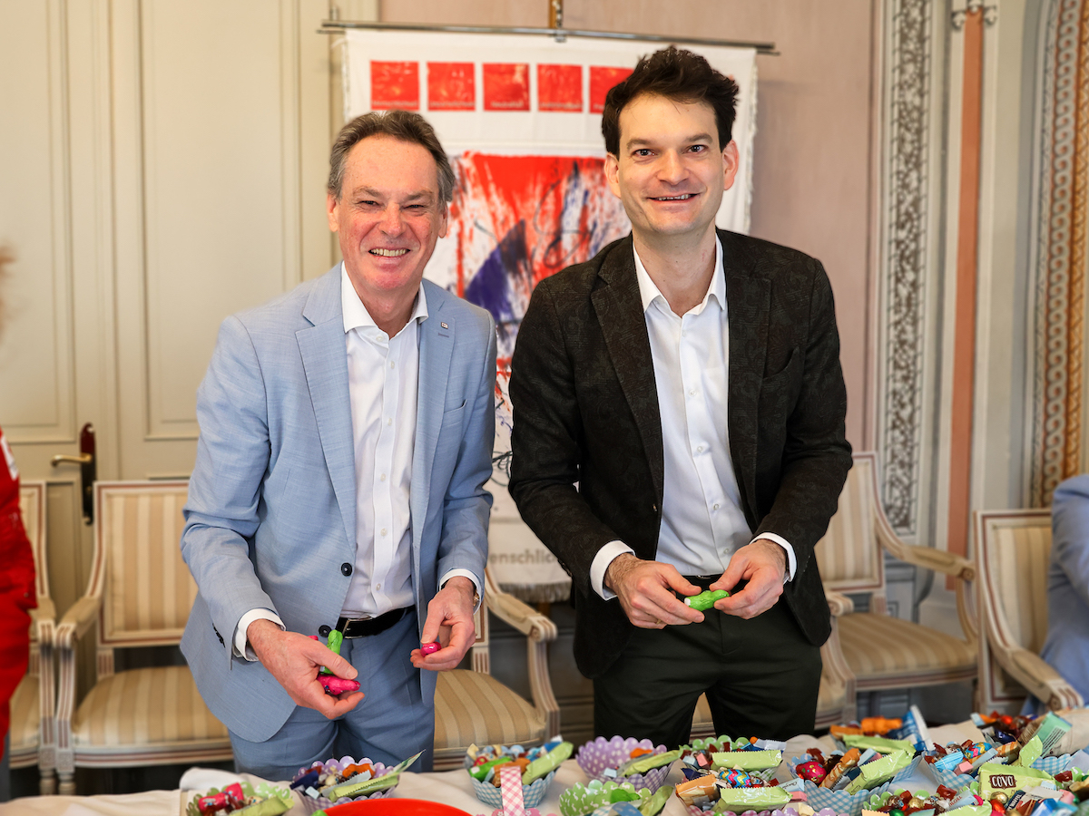 Michael Opriesnig und Johannes Greller beim Packen der Osternester / Copyright: © ÖRK/Magdalena Almandil-Tomc, Abdruck zu PR-Zwecken honorarfrei